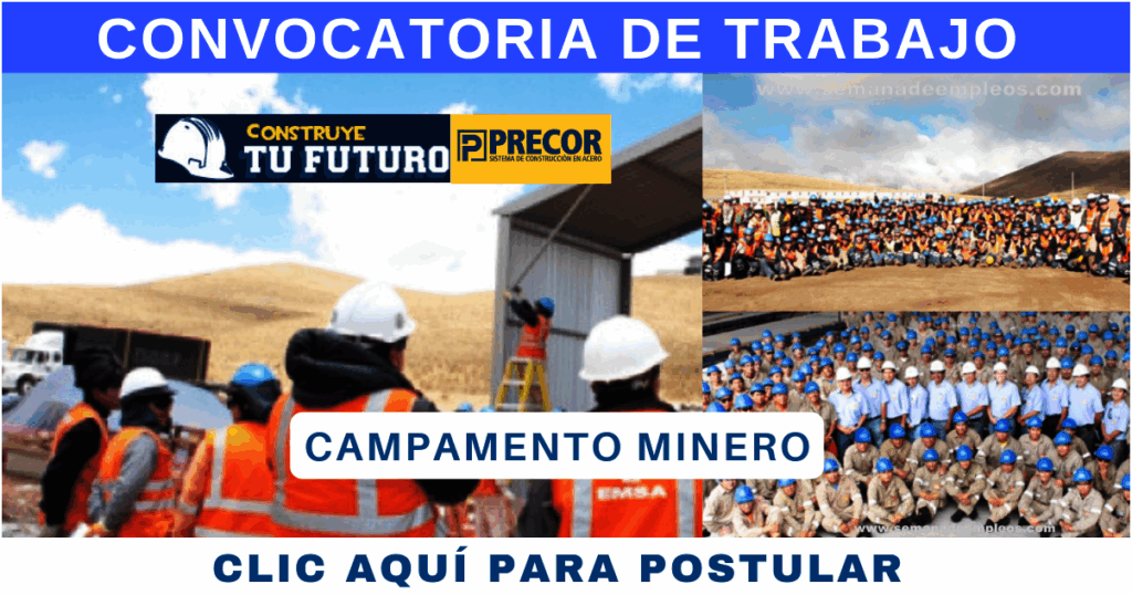 PRECOR, empresa de PMP HOLDING, se encuentra en la búsqueda de personal talentosa con experiencia en diversas compañías de minería, construccion y entre otros, si estas interesado puedes unirte a esta convocatoria.